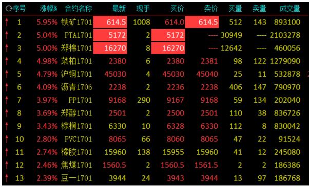 大商所鐵礦石期貨主力合約1701盤中觸及漲停,漲幅6%,報614.5元/噸。PTA及鄭棉期貨漲停。