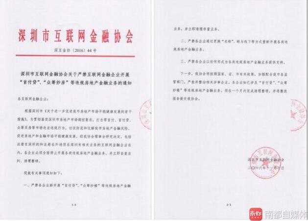南都訊 記者盧亮 昨日,深圳互聯網金融行業協會忽然下發了《關于嚴禁互聯網金融企業開展“首付貸”、“眾籌炒房”等違規房地產金融業務的通知》,與一個月前的深圳“史上最嚴”房產調控新政遙相呼應。按照該協會的解釋,是希望防范和化解深圳市房地產金融風險,促進房地產和金融市場平穩健康發展。今年4月12日,該協會也曾下發停止開發房地產眾籌業務的通知,明確叫停各種形式的房地產眾籌,限7天之內徹底清理相關業務。