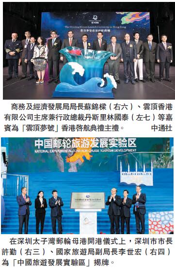 【香港商報网訊】記者王曉蕾、戴合聲報道:昨天,对於着力拓展邮轮旅游发展空间的香港和深圳来说,是个标志性的日子。在深圳,太子湾国际邮轮母港正式开港;在香港,第一艘全年以香港和广州南沙为联合母港的豪华邮轮「云顶梦号」,於启德邮轮码头启航。在两地同时传出的消息称,国际邮轮品牌纷纷抢驻港、穗、深三大邮轮码头,开通航线,显示出邮轮公司和资本市场对三地市场的重视和未来进一步深耕的意图。