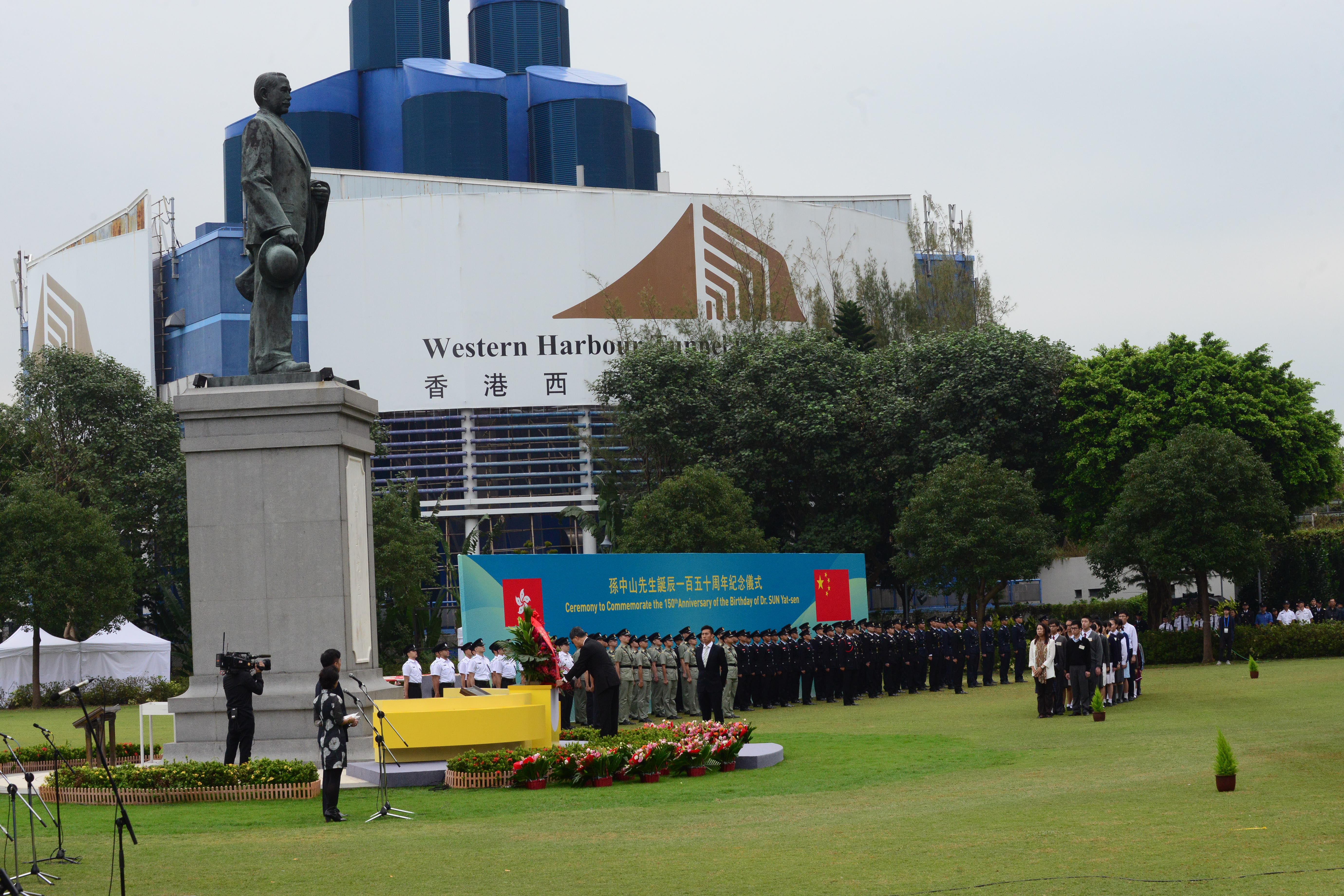 梁振英在纪念仪式上向孙中山铜像鞠躬及献花。