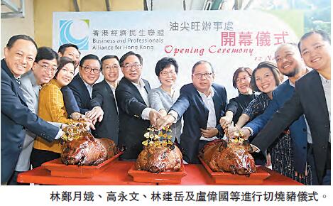 一众嘉宾昨午在经民联监事会主席林建岳、主席卢伟国、副主席林健锋、副主席兼地区事务委员会主席梁美芬及经民联区议员陪同下,共同为设在佐敦渡船角文苑街47号文辉楼地下的办事处进行祥狮点睛及切烧猪仪式,有不少街坊到场支持祝贺,场面热闹。