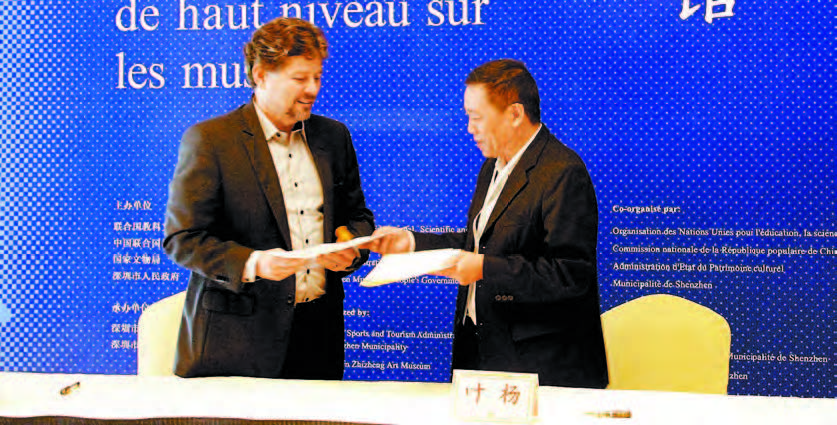 深圳博物館館長葉楊與巴西明日博物館館長里卡多·皮奎特簽訂合作意向書。若笑攝