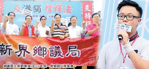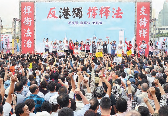 由50個團體組成的「反港獨·撐釋法」大聯盟於昨午4時在金鐘立法會大樓外舉行萬人集會,支持團體達到1000餘個,包括:民建聯、工聯會、經民聯、新界鄉議局等多個團體。在下午4時前,參與集會人士已陸續到達,大批市民由金鐘港鐵站經海富中心天橋前往集會地點,警方需要在沿路實施人流管制措施。