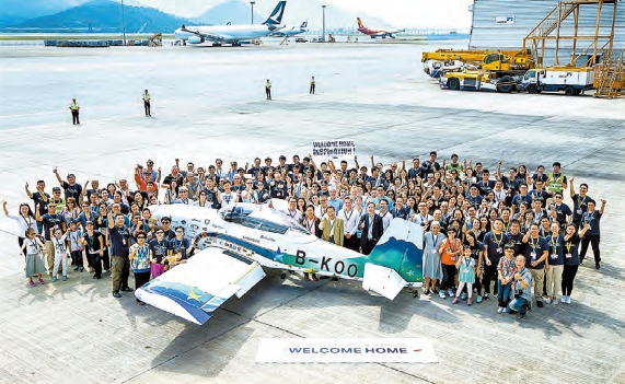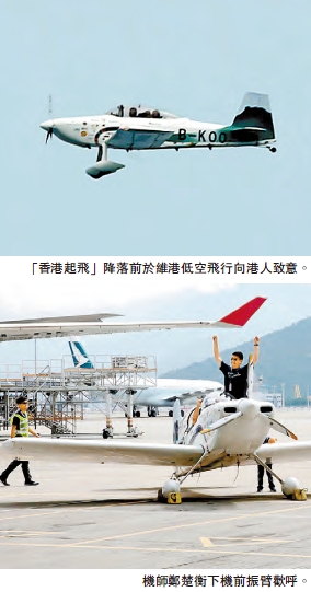 昨日上午10時許「香港起飛」飛抵本港,當飛機飛越維多利亞港時,機師將飛行高度降低至1000多呎,再經鯉魚門及港島南部,降落在香港國際機場。機師鄭楚衡落機後,打開飛機艙門向歡迎他的朋友打招呼,並與妻子及一對兒女擁抱。運輸及房屋局局長張炳良和機場管理局行政總裁林天福,都有到場接機。