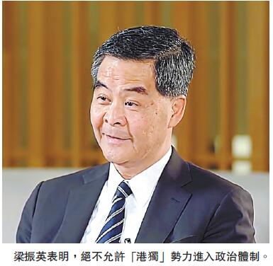 梁振英重申,在整個政治體制當中,港獨分子都不能出現,而他身為特區首長,有責任與特區政府全面切實執行人大釋法。他又提到,非常關注公務員在一些政治問題上的表態,因為公務員在政治上應該中立,尤其是某些部門的公務人員,所以在有關問題上,特區政府毫不含糊。