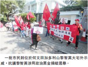 昨日上午11時許,一批示威者聯袂抵達黎智英大宅門前展開抗議行動,各人均手持五星紅旗,並高舉印有「政治黑金操縱選舉禍港殃民」等橫額及呼叫口號,又播放國歌等歌曲。