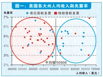 坊間常言,特朗普是靠鄉郊及低學歷的選民支持,因為這些人感受不到近年經濟復蘇的好處,但筆者并不完全同意。圖一顯示,希拉莉與特朗普在全美不同州份的得票分布,并以州份的失業率(最新10月數據)及人均收入(2015年)作分析。圖中見到,希拉莉所得的選票一如所料大多來自較高人均收入的州份,相反特朗普選民的人均收入卻偏低。留意一點,圖中并未見到明顯的人均收入與失業率之反向關系。亦即是,坊間所言特朗普的支持者是低收入人士應是正確,但他們所處的州份失業率未見明顯高企,即這批人是否未能受惠於近年美國的經濟復蘇呢?筆者不敢肯定。