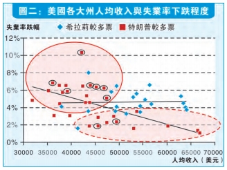 要更準確判斷這些低收入人士有否受惠於近年經濟復蘇,筆者以各州份自2009年10月份全美失業率見頂至今的變動與人均收入作量度。計算過后,在兩黨贏取的州份上,其平均失業率的跌幅(由2009年10月失業率見頂至今年10月)同樣約為5.1%。不過,筆者再仔細觀察下,卻發現一點蛛絲馬迹。