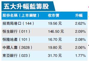 港股炒股不炒市,「北水」力撐內銀股及內險股跑贏大市。中國人壽(2628)首10月原保費收入按年升約兩成,股價升2%報19.8元,中國財險(2328)及中國太保(2601)亦分別升逾2%,金融股普遍向上,建行(939)升1.2%;中銀香港(2388)升0.9%;中行(3988)升0.3%;東亞(023)升1.8%。