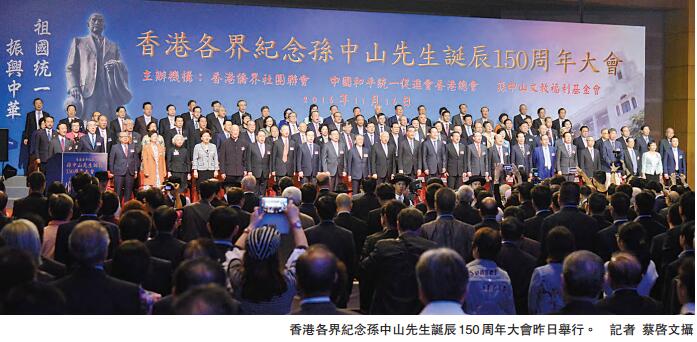 「香港各界纪念孙中山先生诞辰150周年大会」,昨午在会议展览中心隆重举行。活动除了为《孙中山与华侨》图片展进行启动仪式,亦播放缅怀孙中山先生一生的影片「孙中山与香港」,并透过香港青年及学生表演配乐诗朗诵「孙中山与我们」,纪念孙中山先生的不朽功勳,海峡两岸暨港澳地区多名社会贤达、专家学者、工商翘楚以及孙中山先生後人亲属和海外嘉宾约1200人出席。