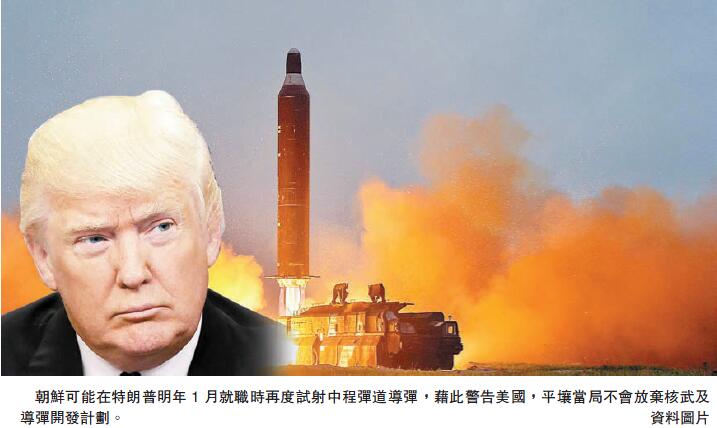 【香港商報訊】特朗普當選美國新任總統后,分析預期他在外交方面面臨的最大挑戰將是朝鮮核武與伊朗問題,以及朝伊之間的密切軍事聯盟關系。CNBC近日引述軍方消息稱,朝鮮可能在特朗普明年1月就職時再度試射中程彈道導彈,藉此警告美國平壤當局不會放弃核武及導彈開發計劃,而屆時伊朗觀察員將會現場見證朝鮮導彈的科技水平。