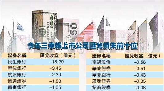 從今年數據來看,目前披露匯兌損益信息的公司中,民生銀行匯兌損失最為嚴重,截至三季度末的匯兌損失是18.29億元,而去年年底其還有2.3億元的匯兌收益。對此,民生銀行此前在電話會議上曾表示,不能以偏概全,不要單看匯兌損益。匯兌損益、投資收益和公允價值變動損益,三個報表合在一起看才能真正反映外匯業務、貴金屬和市場風險敞口的波動影響。