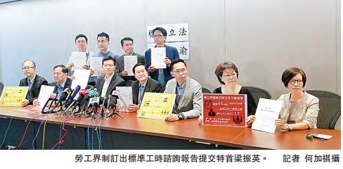 劳工界立法会议员及已退出标准工时委员会的劳顾会雇员代表,昨早向梁振英提交由劳工界早前自行进行谘询的标准工时立法谘询报告。劳顾会委员吴秋北表示,今次谘询分两阶段在今年4月至9月期间进行,共透过意向问卷调查及谘询大会收集工会及会员就标准工时立法的意见,分别得到262及312个工会的回覆。