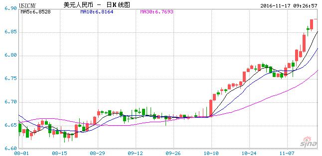 新浪財經訊 11月17日中國外匯交易中心公告,人民幣匯率中間價報6.8692,貶值100個基點,連續十個交易日下跌,累計貶值逾1200個基點,該數據創下了2008年8月以來的新低。