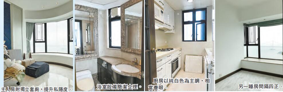 兩間睡房亦各具特色,主人房附設特大弧形窗,讓住戶可從多角度欣賞海景,並有助增加室內採光度,令睡房別具生氣,而睡房亦特別採用了入牆衣櫃,騰出更多空間讓住戶擺放各類家具,令睡房實用性大增。另一間睡房則呈方形設計,間隔四正,擺放床具上同樣不失靈活性。至於廚房,空間雖然不大,但勝在廚櫃及各樣電器對列排開,只要住戶於煮食稍作轉身,即可滿足各樣需要。