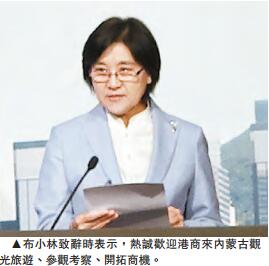 內蒙古自治區主席布小林致辭時表示,香港是內蒙古的重要貿易夥伴,目前港資企業在當地有1400多家,占境外投資總額一半以上,越來越多的內蒙古企業是依託香港平臺走向世界。隨著「一帶一路」建設的深入推展,兩地的聯繫將更緊密和更廣泛。她呼吁港商更多到內蒙古投資發展,共享發展機遇,共創美好未來。