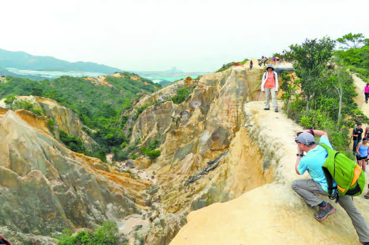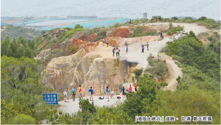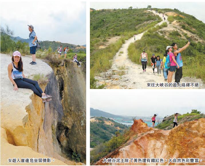 港版大峽谷雖比美版細小得多,但也不容小覷,谷深20米,約7層樓高度,崖邊筆直,望而生畏。但現場所見,不少人藝高膽大,如坐於崖邊,雙腳懸空擺姿勢拍照,一些則作直立俯視狀。其實這些地貌都是風化而成,有潛在危險,遊玩時須提高警覺。