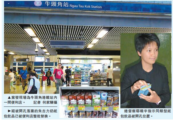 事主前日下午在便利店购买一盒朱古力奶饮用,返回鸿图道1号的办公室便感到不适,其後检查纸盒,发现盒顶近饮管位置有一小孔,疑是被针筒刺穿,大惊报警後送院检查,并已抽取事主的血液及尿液作毒理化验,相信化验要数星期始有结果,警方亦已将有关纸盒送往政府化验所进行化验,重案组探员昨日到便利店检查所有同类饮品,其他货品均无针孔,并查问相关饮品公司,供应商表示同类饮品暂时不用下架。