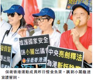在案件昨早開庭前,保護香港運動逾20名成員在高院外請願,指劉小麗以「龜速」宣誓顯然是不想效忠《基本法》,促請法院取消劉小麗議員資格。示威人士現場舉辦「食魚蛋斗慢大賽」,以12分23秒慢動作食魚蛋,抗議劉小麗「龜速」讀出誓詞。