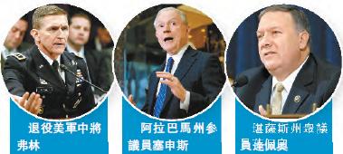 據悉,現年57歲的弗林還曾任美國國防情報局局長。在大選中,弗林一直擔任特朗普的高級顧問。而現年69歲的塞申斯是最早公開表態支持特朗普的現任參議員。在競選期間,塞申斯曾幫助特朗普起草國家安全事務的政策綱領。至於現年52歲的蓬佩奧還是美國會眾議院班加西事件特別委員會成員。他多次批評前國務卿希拉莉在班加西事件中存在過失。目前,上述3人均已表態接受特朗普提供的崗位。