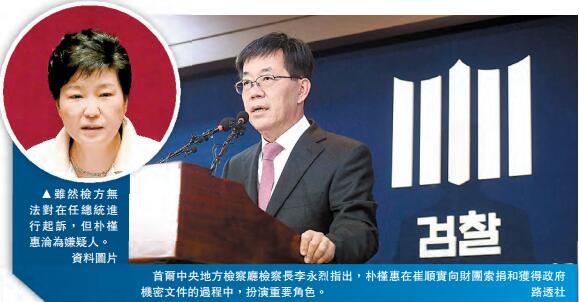 【香港商報网訊】韓國檢方昨日以涉嫌向各大企業施壓索捐巨額資金為由,起訴「親信干政門」首犯崔順實等3人。檢方在起訴書中更指出,韓國總統樸槿惠涉嫌「共謀作案」,在崔順實索捐和獲得政府機密文件過程中扮演重要角色,被列為「嫌疑人」,但由於樸槿惠作為總統享有刑事豁免權,目前無法提起公訴。樸槿惠的律師表明不接受指控,指為純屬推測想像。樸槿惠現也改口表明不會接受問話。