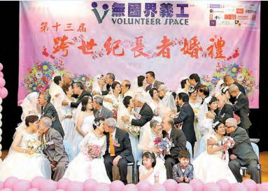 【香港商報網訊】無國界義工於每年的長者日都會舉辦「跨世紀長者婚禮」,不經不覺今年已是第13個年頭。昨日有19對60歲以上之「銀髮新人」,在主禮嘉賓龐愛蘭、律師、子女及親朋的見證下進行一個溫馨難忘的婚禮。他們加起來的結婚年數合共達838年。