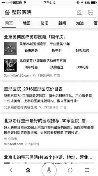 北京青年報11月21日報道,受“魏則西事件”影響,莆田系醫院從百度排行榜上銷聲匿跡了不到半年,如今又有重新打鼓另開張的跡象。北京青年報記者近日調查發現,莆田系醫院又殺回醫療競爭市場,只是這一次,莆田系醫院更換了推廣手段,打出“醫美分期”的招牌,以貸款美容的形式再次打入百度搜索首頁。