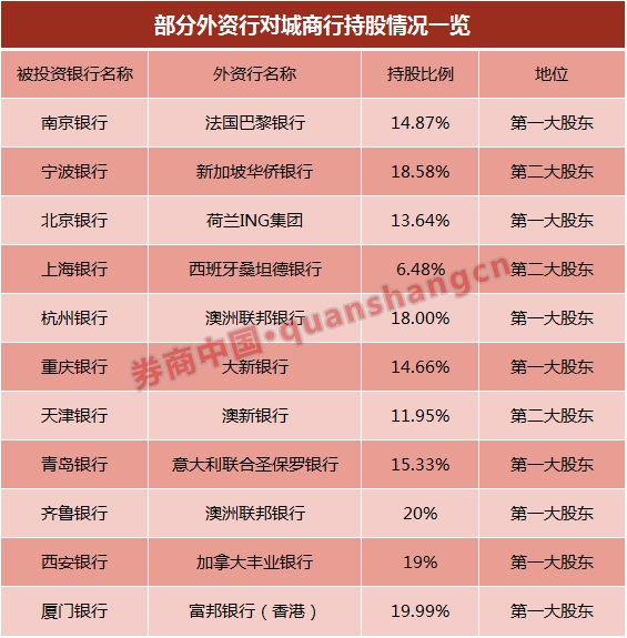值得注意的是,不少外资行作为战略投资者持有境内中小银行股权,具体见下表。