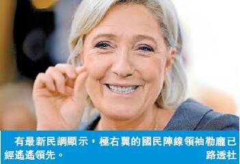 英國《獨立報》較早前指出,民調顯示法國極右翼黨派國民陣線領導人勒龐「幾乎沒有可能」當選總統。但到了周日,《獨立報》最新文章則表示,勒龐卻已經在民調中遙遙領先,尤其在她的主要勁敵薩爾科齊已退出的情況下。周日公布的Ipsos民調顯示,和法國前總統薩爾科齊和左翼黨主席梅蘭雄相比,勒龐的支持率達到29%,將這二人甩在身後。前二者的支持率分別為21%和14%。