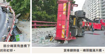 【香港商報網訊】記者萬家成報道:一輛運載磚頭重型貨車,昨晨在彩虹邨對開天橋上翻側,車斗上磚頭散滿橋面,部分磚頭更恍如「磚雨」般,飛墮橋下彩虹邨內,幸無擊中任何人。肇事貨車司機則受傷送院,通往龍翔道方向車輛無法行駛,交通癱瘓5小時,至少24條巴士線需要改道,至下午接近下班時間,警方將肇事貨車拖走始解封通車。