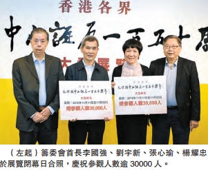 「香港各界紀念孫中山誕辰150周年展覽」11月9日舉行開幕酒會,11日公開展出,至昨日下午2時正式閉幕。展覽籌委會多位主要成員包括主辦機構首長戴德豐、楊釗、盧文端、施榮懷、楊耀忠、徐莉、張心瑜,總監劉宇新,秘書長李國強、副秘書長魯夫、馬浩文等特別到場參觀,並見證展覽圓滿結束。籌委會代表認為,當前香港時政在「反獨及宣誓風波」下,正好通過今次展覽讓市民尤其年青一代了解孫中山生平及中國近現代歷史,增加對國家和民族的認同與愛國情懷,學習、繼承和發揚孫中山先生精神,同心協力,振興中華。是次展覽大受市民歡迎,在兩周展期內,超過三萬人次入場參觀,打破歷年展覽紀錄,籌委會對成果深感鼓舞。