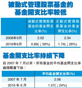 報告顯示,所有強積金類別的基金開支比率均有所下跌,而持續呈現下跌趨勢。強積金基金的平均基金開支比率,從2007年7月2.06%,下跌24%至2016年10月的1.56%,為紀錄以來的最低水平。