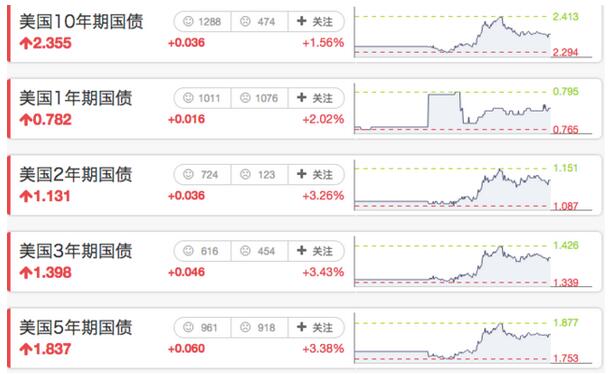 美國10年期基準國債收益率漲3.6個基點,至2.355%。兩年期美債收益率漲0.4個基點,至1.135%。五年期美債收益率漲5.8個基點,至1.835%。