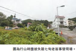 男事主姓黃(73歲),退休前從事會計工作,有行山習慣,幾乎每天都會行山晨運鍛煉體魄,風雨不改。昨晨9時許,黃翁不理家人勸告,冒雨出門,獨自到沙田行山,由於他至中午仍未回家,家人致電其手機又無人接聽,女兒擔心他出事而報警求助。由於家人僅知道黃翁喜愛到黃泥頭一帶行山,惟不知正確位置,消防員得悉情况后,即在上址一帶搜索,卻一直沒有發現。