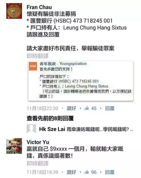 不久,“青政”又声称Paypal帐户被冻结,呼吁市民改用其他捐款途径,并公布梁颂恒的汇丰银行个人户口号码。而事实是,其Paypal户口被冻结,理由竟是“青政”没有预先申请。网民就狠批“青政”众筹是“呃人”(骗人),讥讽梁游“唔单止唔识宣誓,连PayPal条款都唔识睇”。
