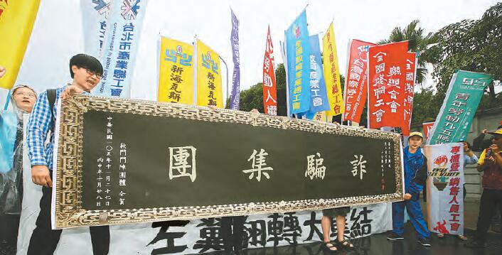 【香港商報網訊】台灣地區2016「秋鬥」遊行昨日登場,54個鬥陣團體在民進黨黨部前集結遊行,訴求「人民要正義、戳破假轉型」,現場還將寫有「詐騙集團」的匾額送給蔡英文。