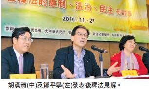 亚太法律协会昨日举办「後释法的宪制、法治、民主」研讨会。胡汉清在会上表示,人大释法内容的其中一个重点,是提醒香港分裂国家有法律责任,而在普通法架构,指的为刑事责任,特区政府应该把关但却未有做好这工作。胡指出,政府称鼓吹「港独」是违背《基本法》,但却一直未有检控相关人士。9月1日民族党公然到学校派发单张,到後来挂「港独」旗号的人士又欲参选进入立法机关,这些情况在港英时代不可能发生,质疑政府是否仍有法治底线。