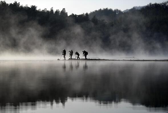 11月28日清晨,几名摄影爱好者在安徽省黄山市黟县的奇墅湖边拍摄风光。