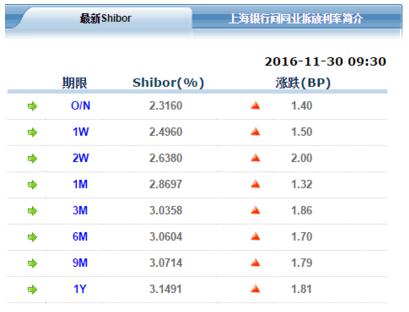 今日隔夜shibor報2.3160%,上漲1.40個基點。7天shibor報2.4960%,創15個月高點,突破9月29日跨季的2.4870%,上漲1.50個基點。3個月shibor報3.0358%,上漲1.86個基點,連漲30個交易日,創2010年12月底來最長連漲周期。