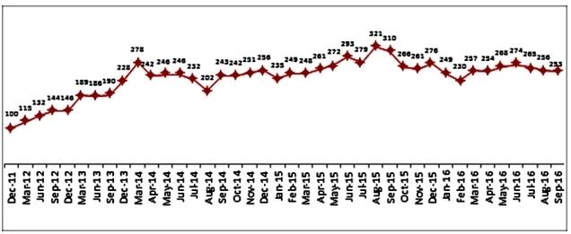 中國銀行日前發布2016年9月份跨境人民幣指數(CRI)。結果顯示,9月份CRI指數為253點,較上月下降3點,較上年末下降23點。