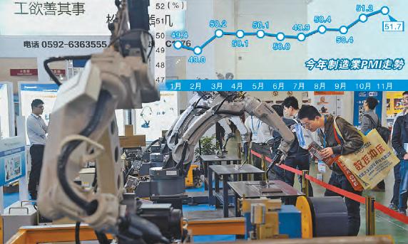 國家統計局昨日公布數據顯示,11月中國制造業PMI為51.7,好於預期和前值,比10月上升0.5個百分點,升至兩年來的高點。而同日公布的財新PMI為50.9,較10月回落0.3個百分點,但仍為2014年7月以來的次高增速。有專家表示,制造業和非制造業一直在持續回暖,釋放出經濟增長由落轉穩的信號,但因本輪房地產調控的負面效應尚未顯現,加上通脹壓力加大,制造業和經濟的走勢將在向好的大趨勢中有波動。香港商報記者張幸