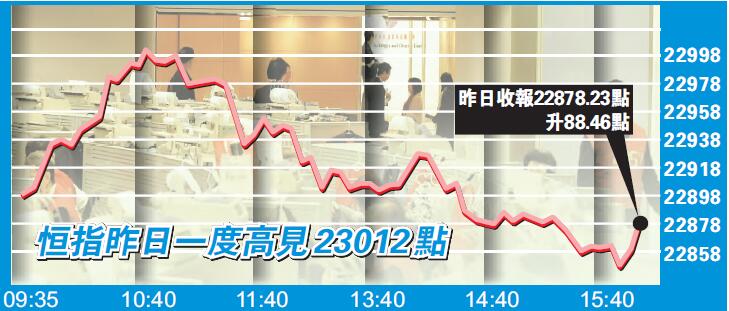 油組會議終達成減產協議,國際油價急升近一成亦帶動石油股造好,加上落後的中資電訊股有資金追捧,昨天恒指借勢上升,並且順勢將23000點的熊證收回。