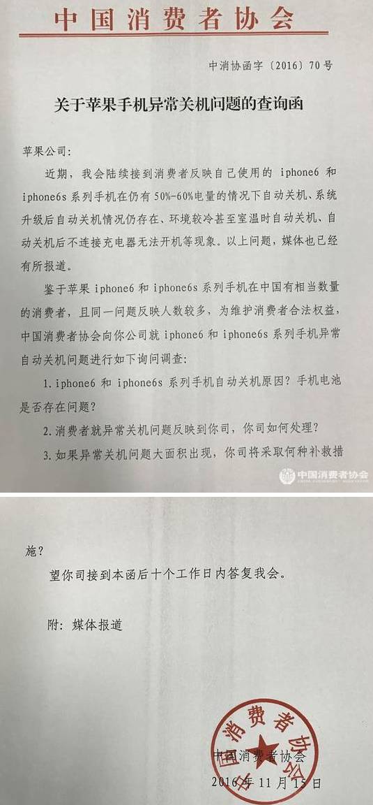 近期,中國消費者協會先后兩次公開函詢蘋果公司iPhone手機異常關機的問題。對此,上海市消保委方面也曾于11月就iPhone手機異常關機等問題多次約談蘋果公司。盡管蘋果公司發布了《iPhone6s意外關機問題計劃》,但大量發生異常關機問題的iPhone6、iPhone6 plus和iPhone6s plus以及生產日期在2015年9月至10月之外的iPhone6s手機依然故障原因不明,眾多的消費者投訴亟待解決。