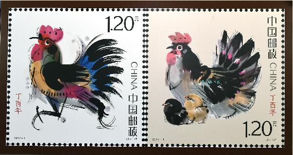 《丁酉年》郵票正式圖稿一套兩枚,第一張“意氣風發”為一只奮起奔跑的雄雞形象,象征中國的快速發展;第二張“丁酉大吉”為一只母雞呵護兩只小雞的溫馨畫面,寓意家庭美滿的願望。丁酉年生肖郵品除了傳統的首日封、郵折、版冊等產品之外,還將發行《丁酉年》郵票金等貴金屬郵品,以及眾多時尚創新的生肖主題郵品。