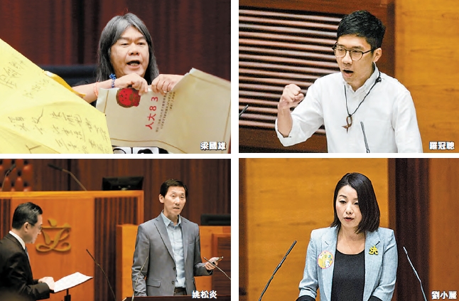 梁國雄則手持黃傘及「人大831決議」紙板,高叫「雨傘運動、不屈不撓、人民自主自決、梁振英下台」等,宣誓時又多次停頓。