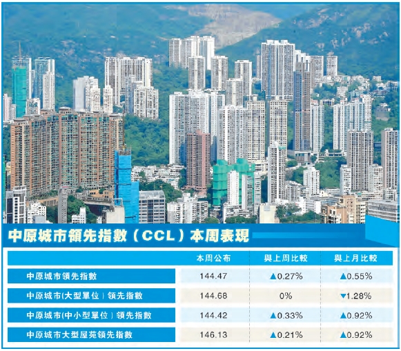 中原城市領先指數(CCL)最新報144.47點,創59周新高,按周升0.27%,連升3周共0.68%。中原城市大型屋苑領先指數(CCL Mass)報146.13點,創60周新高,按周升0.21%。CCL(中小型單位)報144.42點,創60周新高,按周升0.33%。CCL(大型單位)報144.68點,為56周第三高,按周無升跌。
