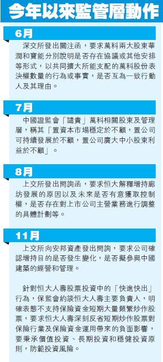 2016年以來,以萬能險為代表的保險資金,頻頻現身資本市場並舉牌,在中國內地引發市場廣泛關注。其中,就包括寶能系舉牌萬科,恒大人壽進出梅雁吉祥等。今年7月,證監會就曾經罕見「譴責」了萬科相關股東及管理層,稱其「置資本市場穩定於不顧,置公司可持續發展於不顧,置公司廣大中小股東利益於不顧」。