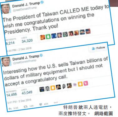 此外,特朗普在當晚7點44分在其推特上就蔡英文致電祝賀一事發文。他在推特上說:「臺灣『總統』今天打電話給我,祝賀我當選總統。謝謝!」推文發出後立刻引發熱烈討論。