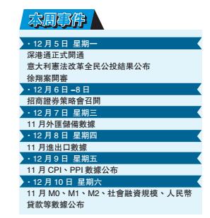 【香港商報訊】本周起,國內外大事件不斷。內地將公布11月CPI、PPI等多項重要經濟數據;深港通利好今日兌現;6日,被稱為A股「四大魔咒」之首的招商證券策略會又要開了。國外方面,意大利公投也已拉開帷幕,黑天鵝隨時可能飛來。