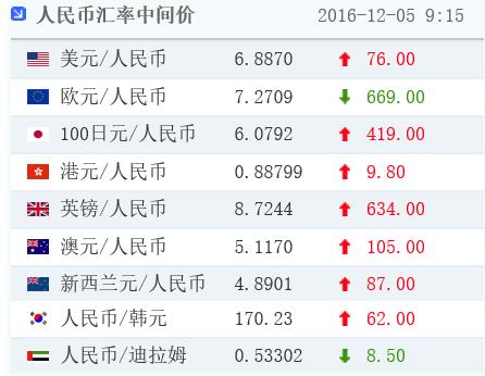 新浪財經訊 12月5日消息,早間中國外匯交易中心發布公告,人民幣(6.8893, 0.0063, 0.09%)匯率中間價報6.8870,較前一交易日貶值76個基點。